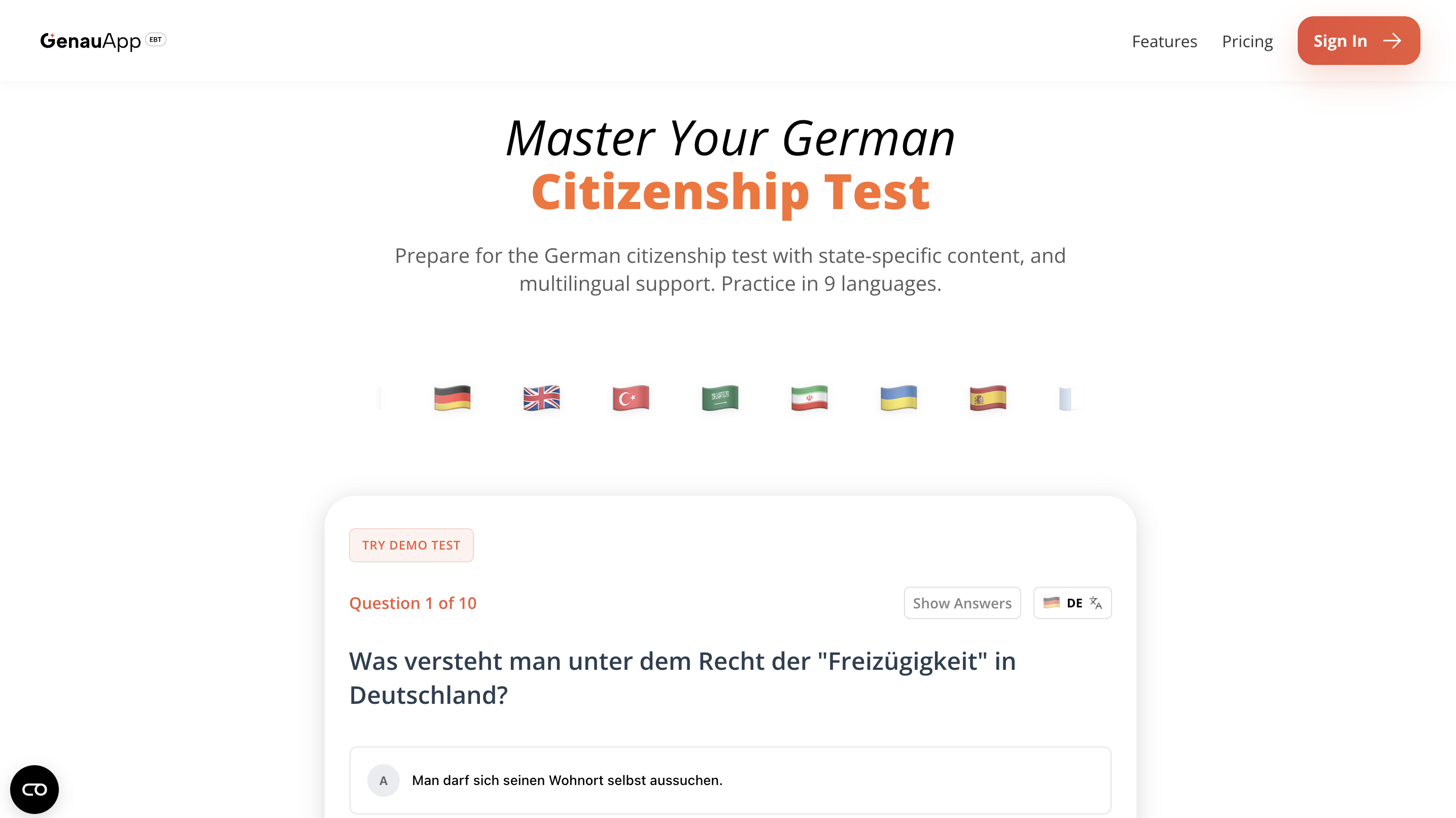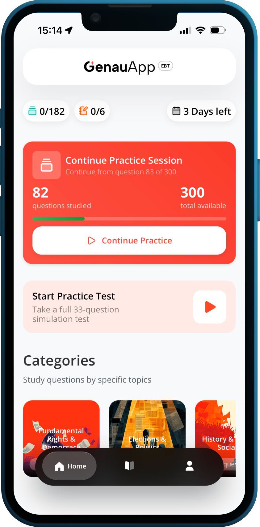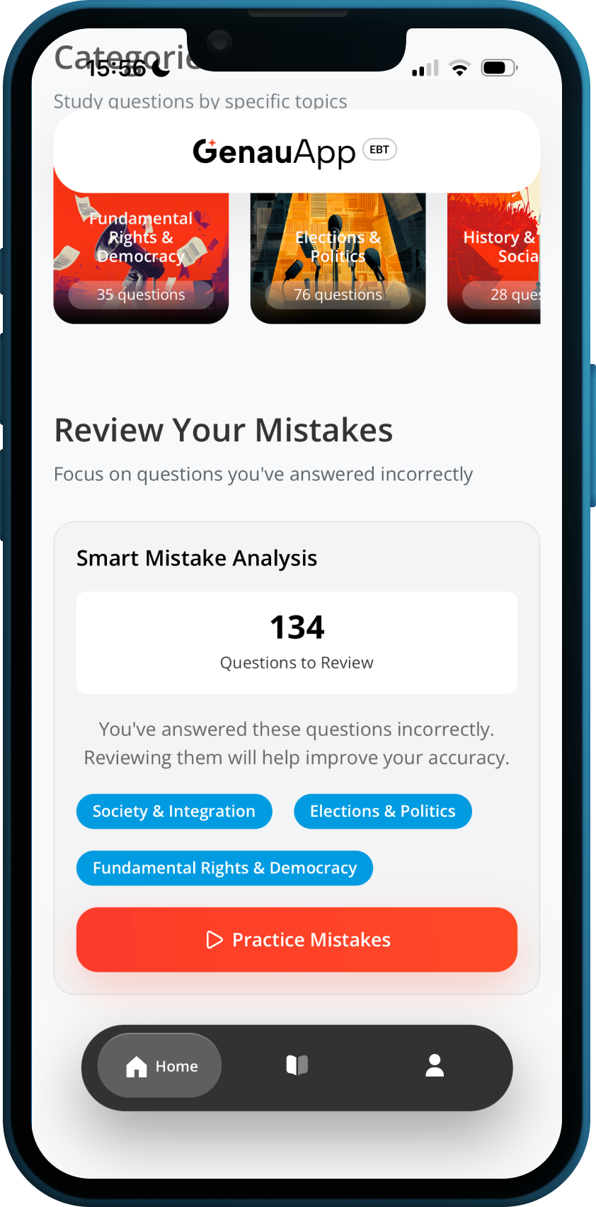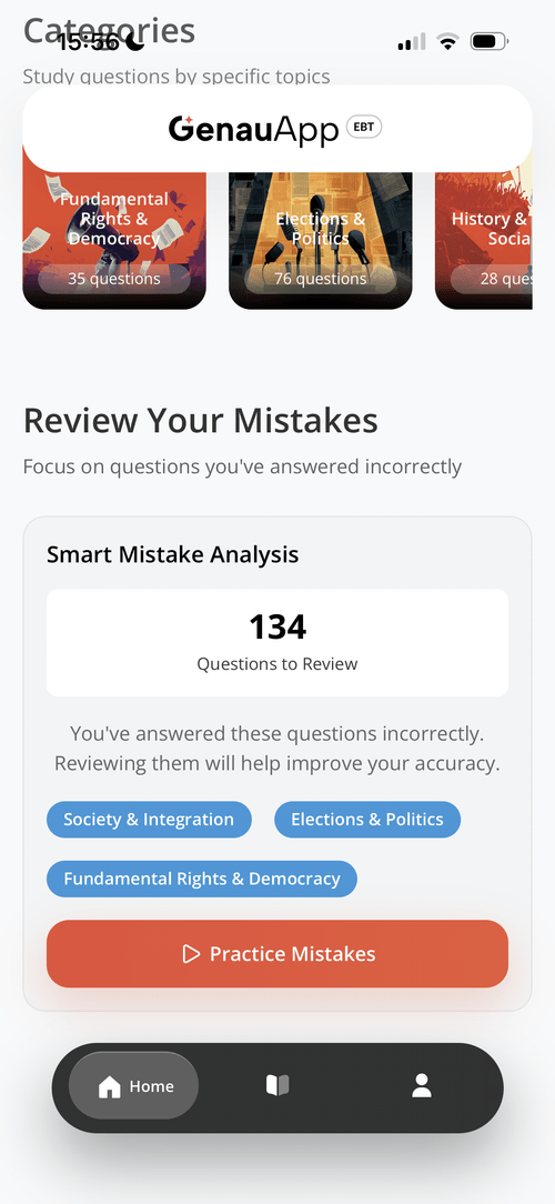 This project focused on designing the Einbürgerungstest (German Citizenship Test) preparation experience within GenauApp.