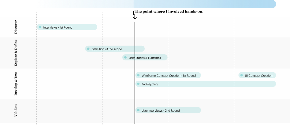 In phase 2, I started supporting the team as a designer as well. Most of the time, I sat together with the internal team and stakeholders to figure out what we needed to get this project successful. Defining the interviewees, creating the interview script, analyzing the interviews, creating the WF, UI, and prototype structures on Figma, maintaining the sprint plans with the team and stakeholders, preparing the workshop schedule, and choosing the methods we're going to use were my primary focuses.