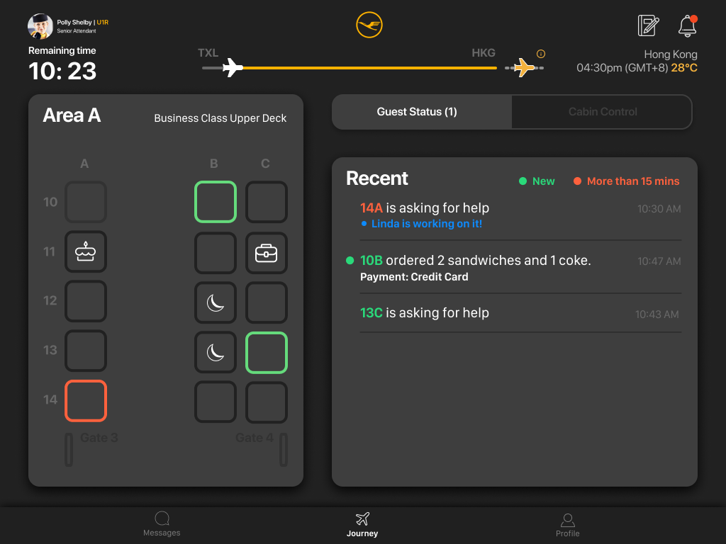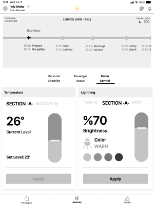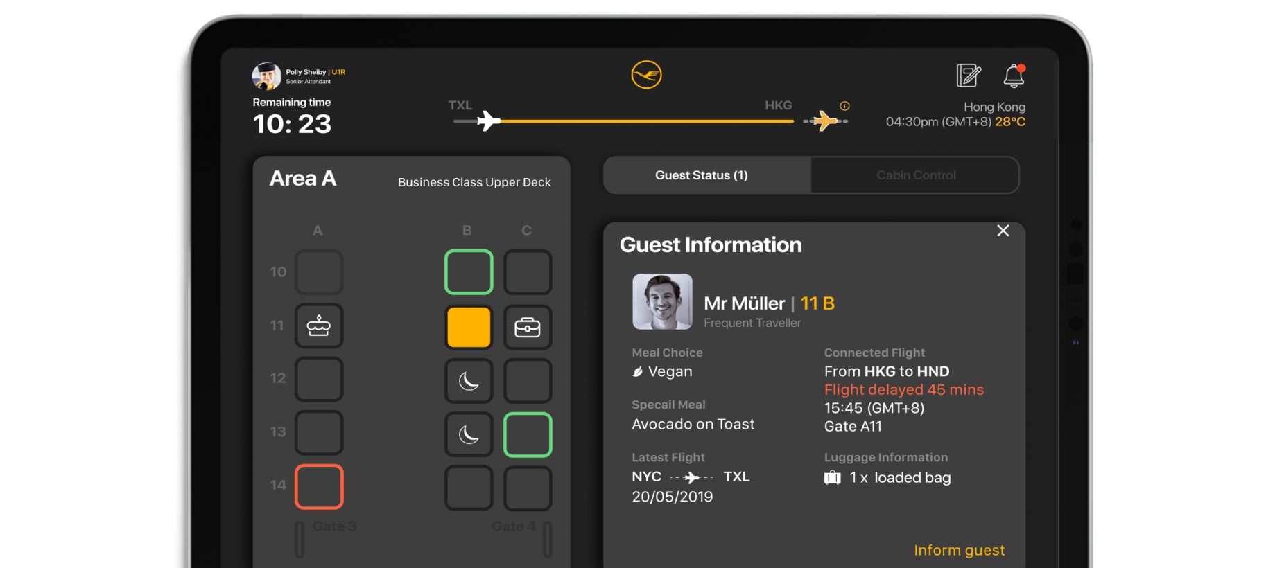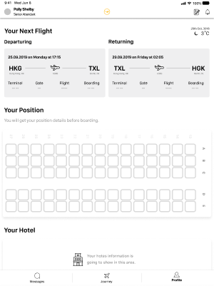 I worked as a design lead for a project with AERQ, a partnership between Lufthansa and LG Electronics. We aimed to design a cabin management tool to be used by flight attendants and airline staff. I played an active role in the research phase, concept design, and customer presentations.